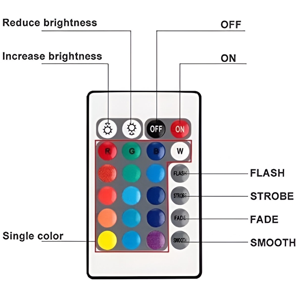 Súprava AQUASHEIN sa dodáva s pohodlným diaľkovým ovládaním, ktoré vám umožní jednoducho nastavovať osvetlenie. Pomocou 24 tlačidiel si môžete vybrať zo 16 farieb RGB a štyroch dynamických režimov (blesk, stroboskop, blednutie, plynulé). Svetlá môžete ovládať zo vzdialenosti až 10 metrov, čo zaručuje bezproblémové prispôsobenie.